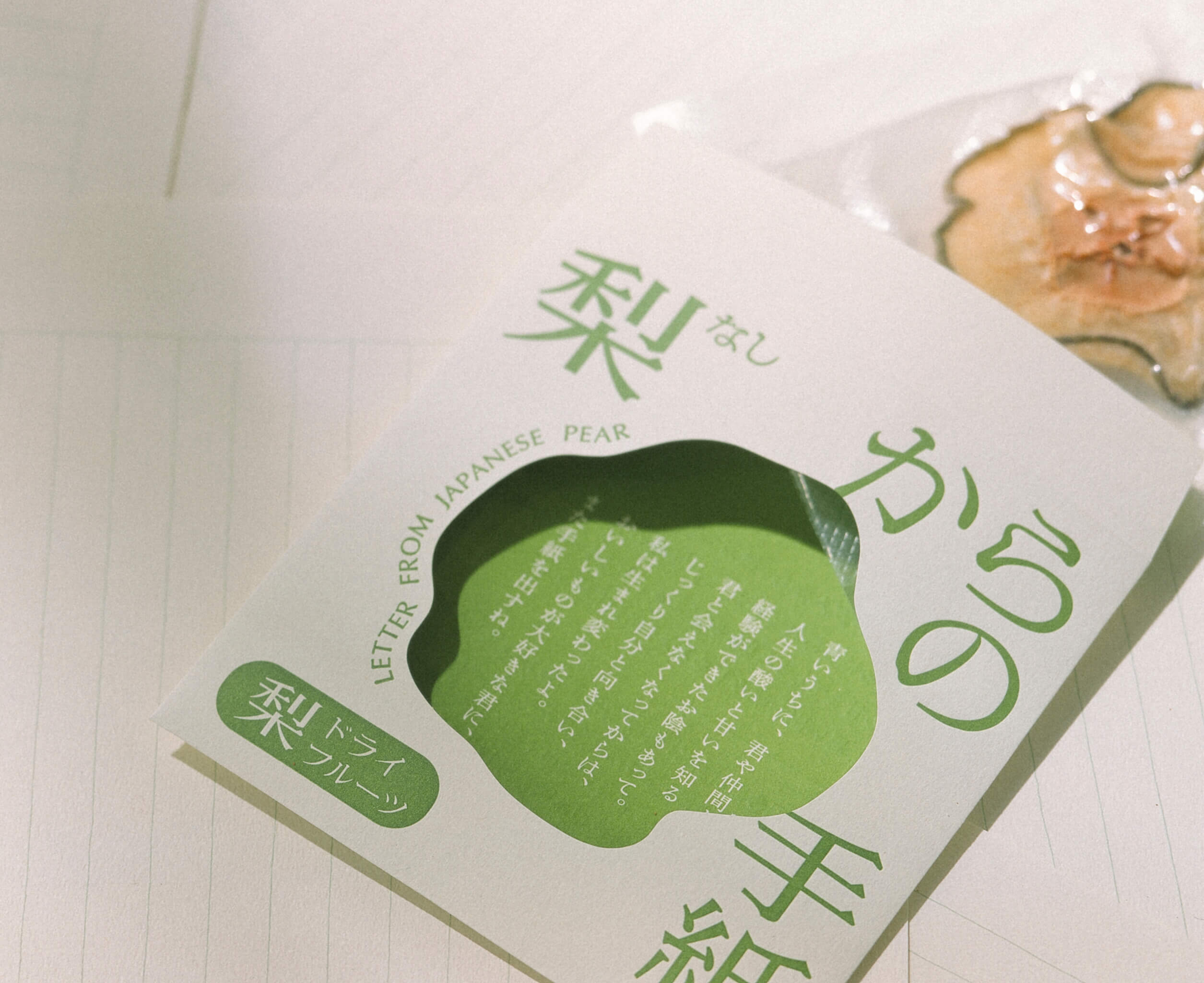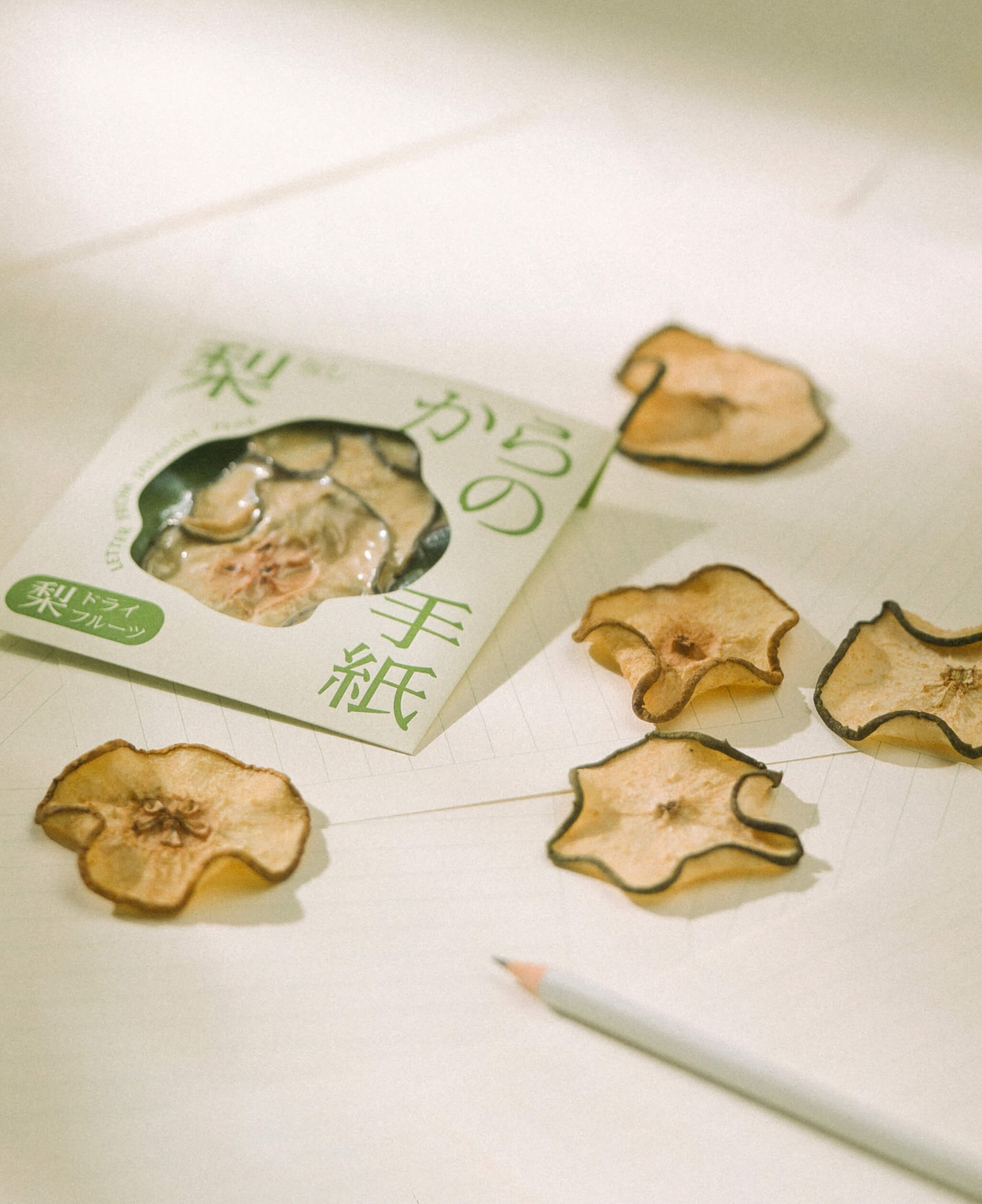 Art direction, naming, logo design, and package design were done by overlaying the dried pear, which exudes sweetness as it is chewed, on a letter.