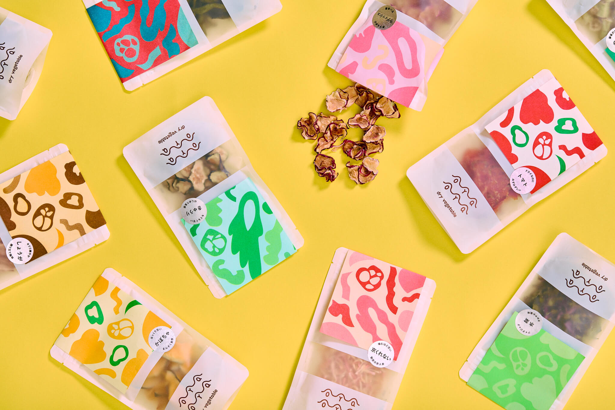 Naming, art direction, logo, package, and poster design, product copy direction, and photography for social media and pamphlets for OYAOYA, a dried vegetable brand using oddly shaped vegetables produced in Kyoto.